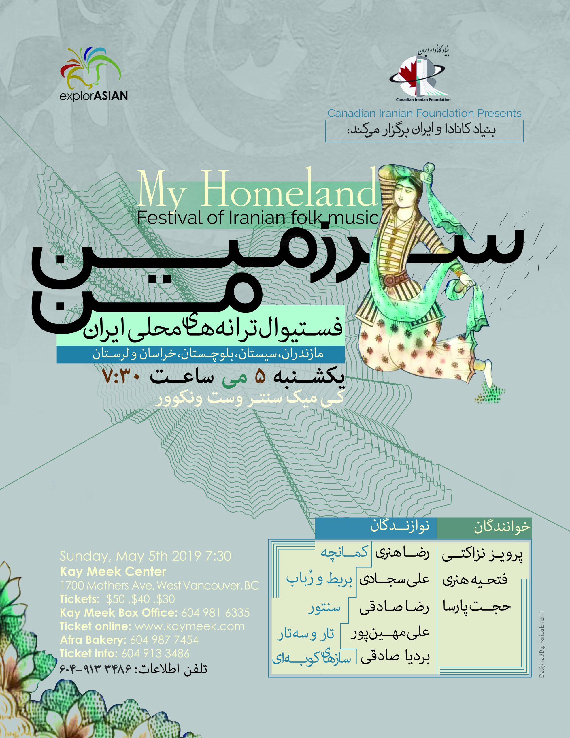 In this unique event, the festive and celebrated music of various regions of Iran such as, Mazendaran, Loristan, Khorasan and Sistan & Baluchistan will be performed by some of the most talented Persian performers living in the Greater Vancouver area.